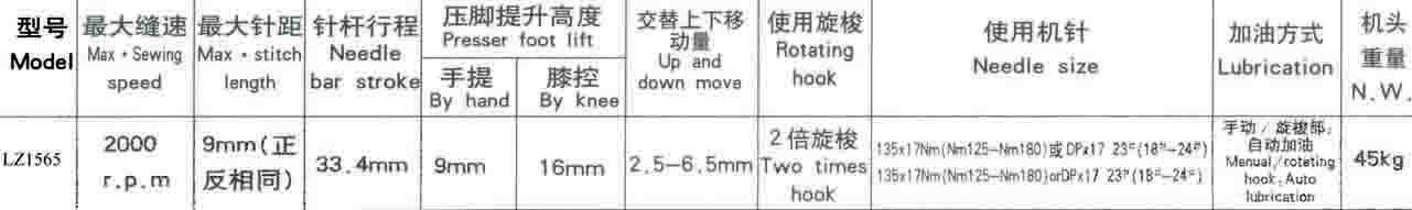採用雙直針、雙立式大旋梭勾線,滑杆挑線,同步齒形帶傳動,旋梭部位自動加油,箱形送料,機針、壓腳、送料牙綜合送料機構。對縫料重疊的不同高度,內外壓腳上、下移動量能夠調節。配置了左、右針杆離合器裝置,實現左右任意針停止及解除停止,安全離合器裝置,以防超負荷引起機器損傷,以及機臂前底線繞線裝置。本機適用各種皮革、人造革、帆布等厚料的角縫。